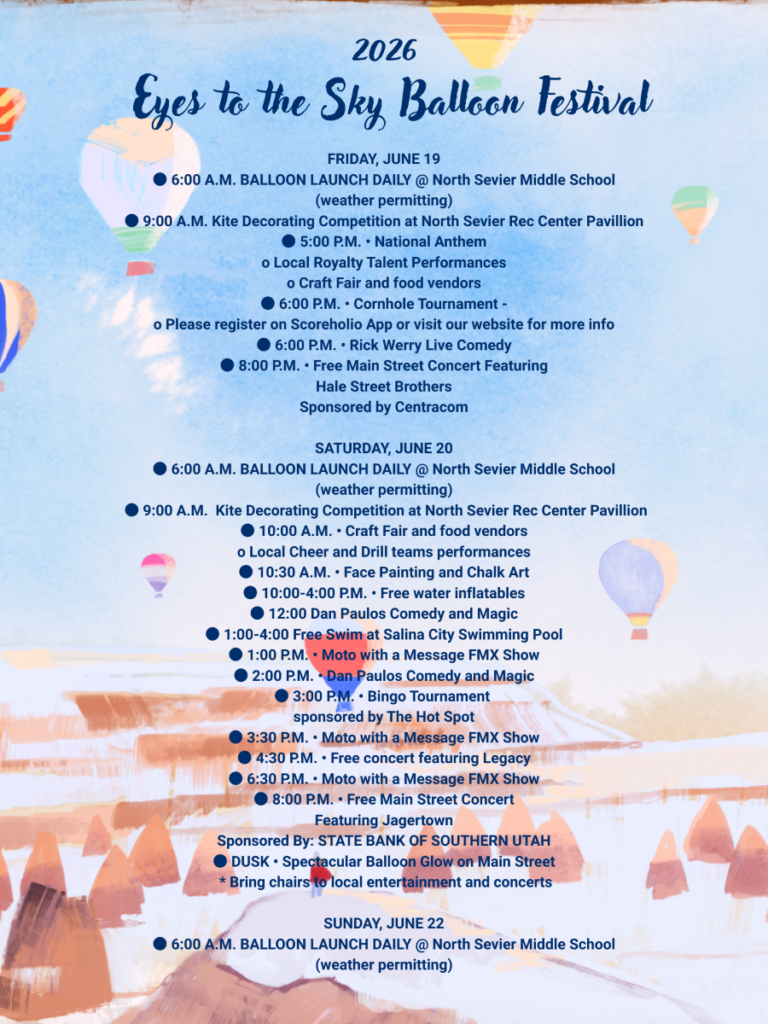 Mark your calendars for the 19th Annual Eyes to the Sky Balloon Festival, soaring high on June 19-21, 2026. Witness the majesty of 20 colorful balloons ascending from the heart of Salina, taking you on a breathtaking journey through one of Utah’s stunning valleys.